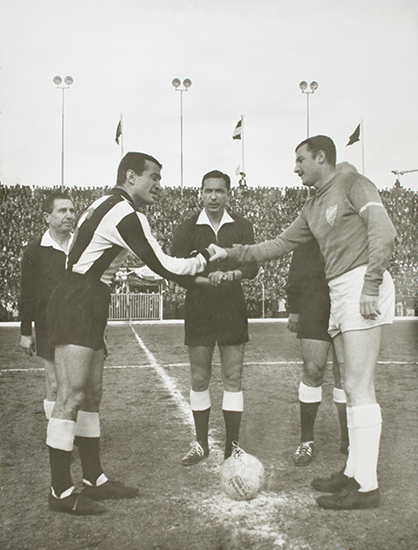 17 Nisan 1966’da oynanan Hacettepe – Beşiktaş maçından önce takım kaptanları Necdet Niş ve Kaya Köstepen birbirlerine başarı diliyorlar. Maçın hakemi Mustafa Gerçeker.