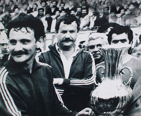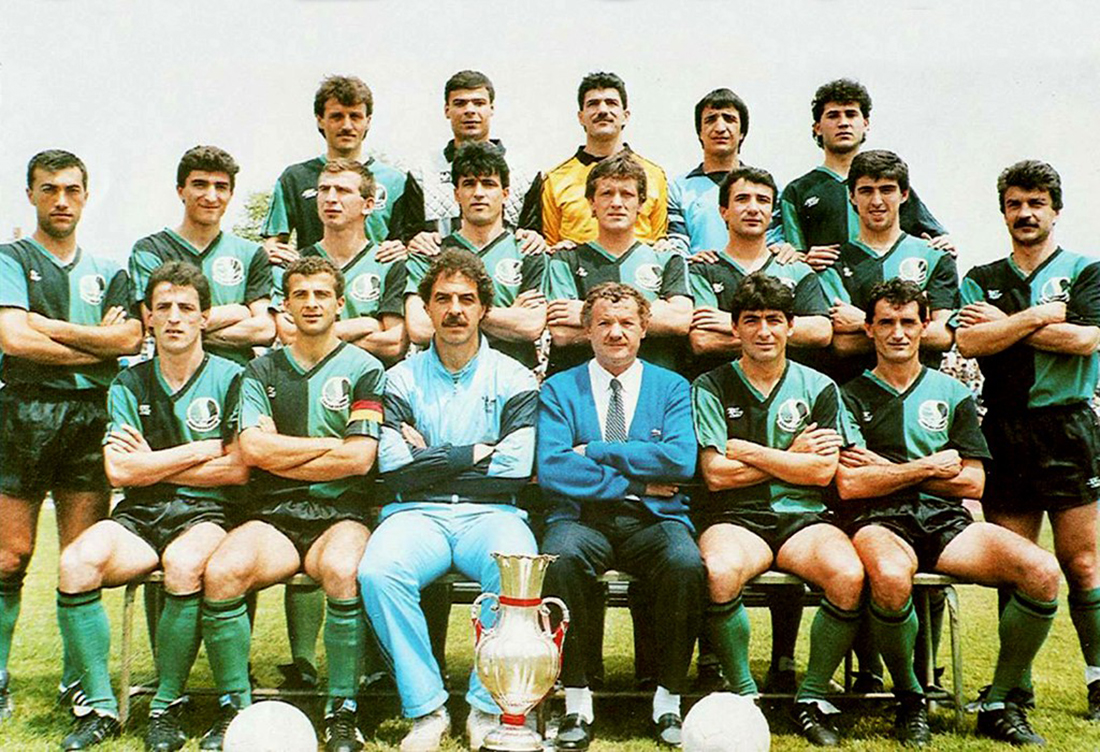 1987-88 sezonu Türkiye Kupası şampiyonu Sakaryaspor. Soldan sağa üst sıra: Ümit Gürsoy, Engin İpekoğlu, Neşet Muharrem, Muammer Gücük, Bülent Erdek. Orta sıra: Selçuk Yiğitlik, Rahim Zafer, Turhan Sofuoğlu, Faton Bingazi, Erol Kolcu, Serdar Şenkaya, Hakan Şükür, Sinan Turhan. Alt sıra: Kemal Yıldırım, Oğuz Çetin, antrenör Erol Togay, Necdet Niş. Özcan Kızıltan, Blerim Mula. (ayaktakileroturanlar.com)