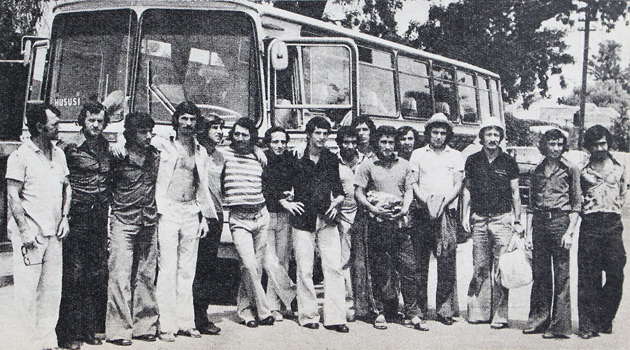 1974-75 sezonu başında, hazırlık kampı için yola çıkan Fenerbahçe kafilesi. Antrenörler Basri Dirimlili ve Necdet Niş sol başta görülüyor. (Hayat Spor)
