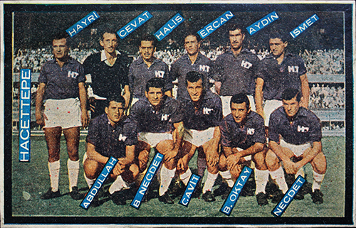 Hacettepe takımı 26 Eylül 1959’da İstanbul’da oynadığı Karagümrük maçından önce. Soldan sağa ayaktakiler: Timuçin Berker, Cahit Sümer, Abdullah Beriş, Aydın Milli, Ercan Ertuğ, Halis Harman. Oturanlar: Cevat Muratal, Hayri Şener, Oktay Arıca, Tayyar Cavcav, Necdet Niş.