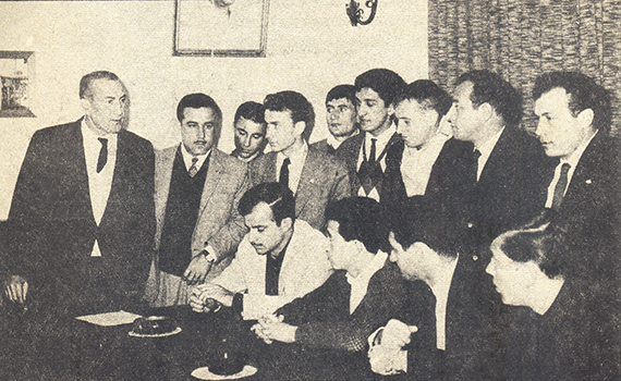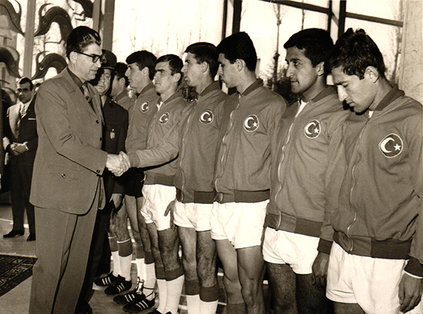 oyuncularımızla tanışıyor. Sağdan itibaren Fenerbahçeli Ziya Şengül, Abdülmetin Kocaoğlu, Altaylı Necdet Tunca ve Ali Rıza Şenol, Vefalı Zeki Temizler ve Beykozlu Nihat Akbay.