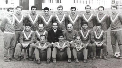 | Mehmet Aydın (üstte soldan dördüncü) ve Sabahattin Kuruoğlu’nun (üstte sağdan ikinci) bulunduğu Göztepe kadrosu Göztepe sahasında. |