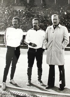 İzmir Atatürk Stadında bir milli maçtan önce Çetin Güler, Coşkun Özarı ve Nazım Özbay. |