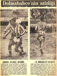 Çamur sahanın azizliği sonucu İstanbulsporlu Ercan Aktuna ile giriştiği mücadele sonucu şortu yırtılan Çetin Güler dönemin usta foto muhabiri İsmet Gümüşdere’ye yakalanmış. |