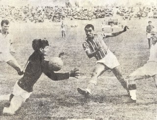 Aynı maçta Çetin Güler, o zaman Galatasaray genç takımı kalesini koruyan Sabri Dino’ya takımının golünü atarken. |