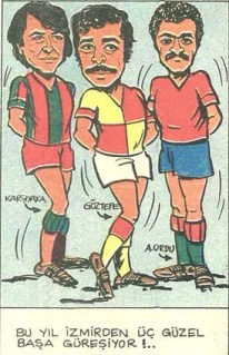 1980-81 sezonunda 2. Ligde şampiyonluğa oynayan üç İzmir takımının antrenörleri Turgay Meto, Erkan Velioğlu ve Çetin Güler Milliyet’te Mesut Yavuz’un karikatürüne konu olmuş.