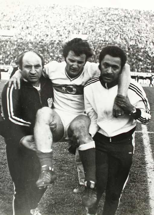 Bir milli maçta sakatlanan Cemil Turan’ı saha dışına çıkarıyor. |