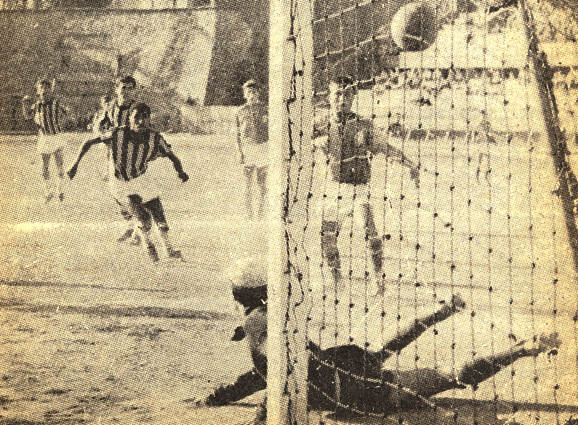 Aynı maçta Çetin Güler, o zaman Galatasaray genç takımı kalesini koruyan Sabri Dino’ya takımının golünü atarken. |