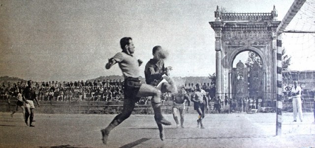 Şeref Stadı dünyanın en ilginç ve güzel fotoğraf veren futbol mekanlarından biriydi. Fotoğrafta İstanbulspor’un Galata ile yaptığı sezon öncesi hazırlık maçında unutulmaz santrforu Aydemir Nemli görülüyor. (Hayat, 23 Ağustos 1957) |