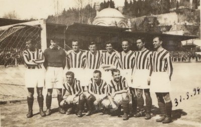 Vefa takımı 1946’da Şeref Stadında bir maça çıkmadan önce. Arka planda Yıldız Parkının girişindeki Küçük Mecidiye camisinin kubbesi görülüyor. (Galip Haktanır koleksiyonu) |
