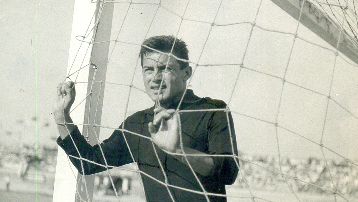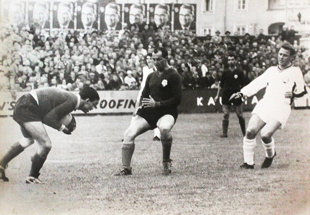 Tarihi Macaristan galibiyetinden önce, 15 Şubat 1956’da Peşte Karması ile oynayan İstanbul Karması’nın kalesini koruyan Şükrü Ersoy, ünlü Macar yıldız Puşkaş’ın tehlikeli bir atağını önlüyor.