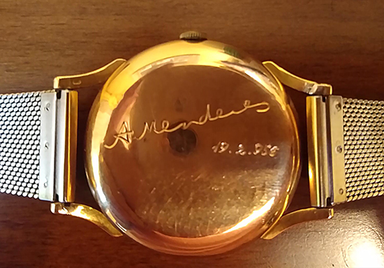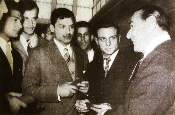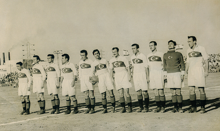 Başbakan Adnan Menderes, 1956’da Macaristan’a karşı milli maçta ve İstanbul Karması’nda oynayan futbolcuları birer altın kol saatiyle ödüllendirmişti. Menderes’in karşısındaki futbolcular (soldan) Saim Tayşengil, Turgay Şeren, Şükrü Ersoy, Ali Beratlıgil ve Nazmi Bilge.