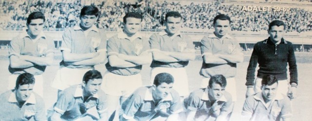 | Adalet 1959-60 kadrosu. Ayaktakiler: Celal Soydan, Muhittin Kıpçak, Bülent, Tezer, Ömer Kandemir. Oturanlar: Erol 3, Vural, Çetin Noyan, Yüksel, Burhan Sargın. |