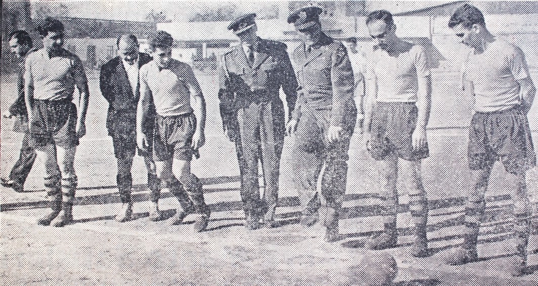 İzmir Ligi 1953-54 sezonunun ilk maçında başlama vuruşunu dönemin NATO İzmir karargahı komutanı General Wyman yapıyor. Generalin bize göre sağında Yün Mensucat takımının antrenör-oyuncusu Adnan Süvari, solunda takımdaki ilk resmi maçını oynayan Metin Oktay var. (Yeni Asır) |
