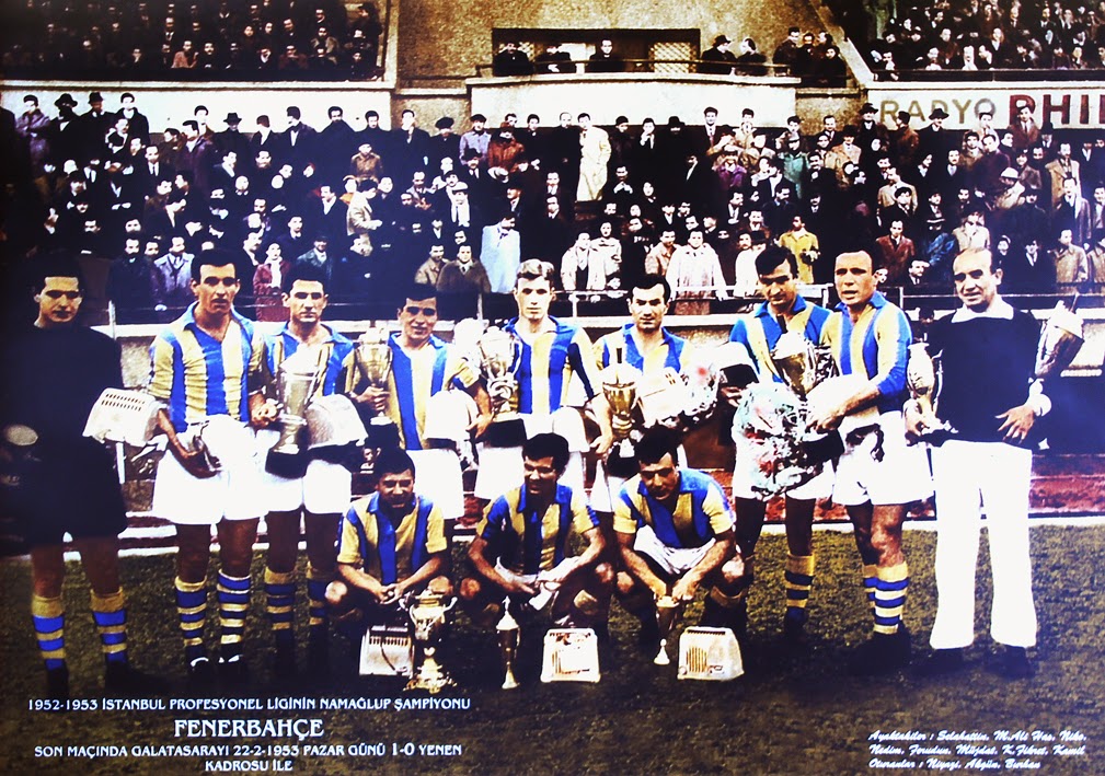 | 1952-53 sezonu şampiyonu Fenerbahçe kaptanı Fikret Kırcan ayakta sağdan üçüncü futbolcu. (Burhan Sargın) |