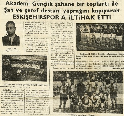 “Gençlik Kulübü iyi bir takımdı. Ligi hep üçüncü veya dördüncü bitirirdik. Dayımın oğlu Bilgin Şekerspor’da oynuyordu. O sene Akademi Kulübü kuruldu ve ikinci lige girdi. Bizim Şeker Stadında iki tane saha vardı: bir ön saha, bir de arka saha. Arka sahada ikinci lig takımları, ön sahada birinci lig takımları oynardı. Biz Bilgin’le maçları tamamladık, arka sahaya geçtik. O gün de Akademi’nin Çağlarspor ile maçı vardı. Kulübün kurucusu Orhan Oğuz geldi. Yanında İlhan Cemalcılar, Ercan Güven, Akar Öcal – bütün asistanlar, doktorlar maçı seyrediyorlar. Biz de yanlarına oturduk. 13-0 mı, 15-0 mı ne mağlup oldular. Orhan Hoca futbolu bilmiyor tabii, bize döndü, ‘Haftaya ikiniz bu takımda oynuyorsunuz,’ dedi. ‘Hocam ancak seneye oynayabiliriz,’ diye zor anlattık durumu. Ertesi yıl Akademi ile Gençlik kulüpleri birleşip Akademi Gençlik adını aldı. İşte o yıl Demirspor ile şampiyonluğa oynadık. Bir puanla şampiyonluğu kaybettik. İyi ki kaybetmişiz. Kaybetmeseydik, Türkiye bölgeler arası müsabakalarına katılacaktık, belki Eskişehirspor da olmayacaktı.”