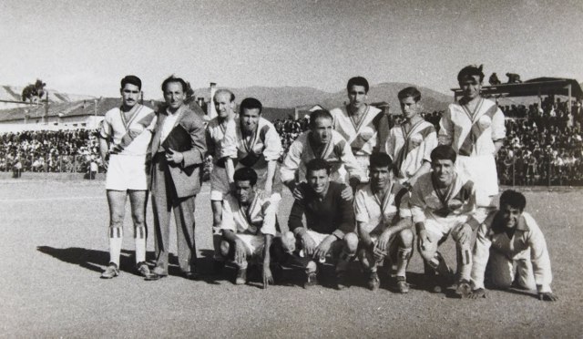 | Palandöken takımı Erzurum’da bir maçtan önce. Sol başta Kenan Buharalı, yanında başkan Ziya Çilingiroğlu. Mesut Buharalı ayakta sağdan üçüncü futbolcu. |