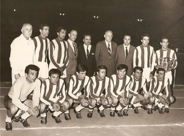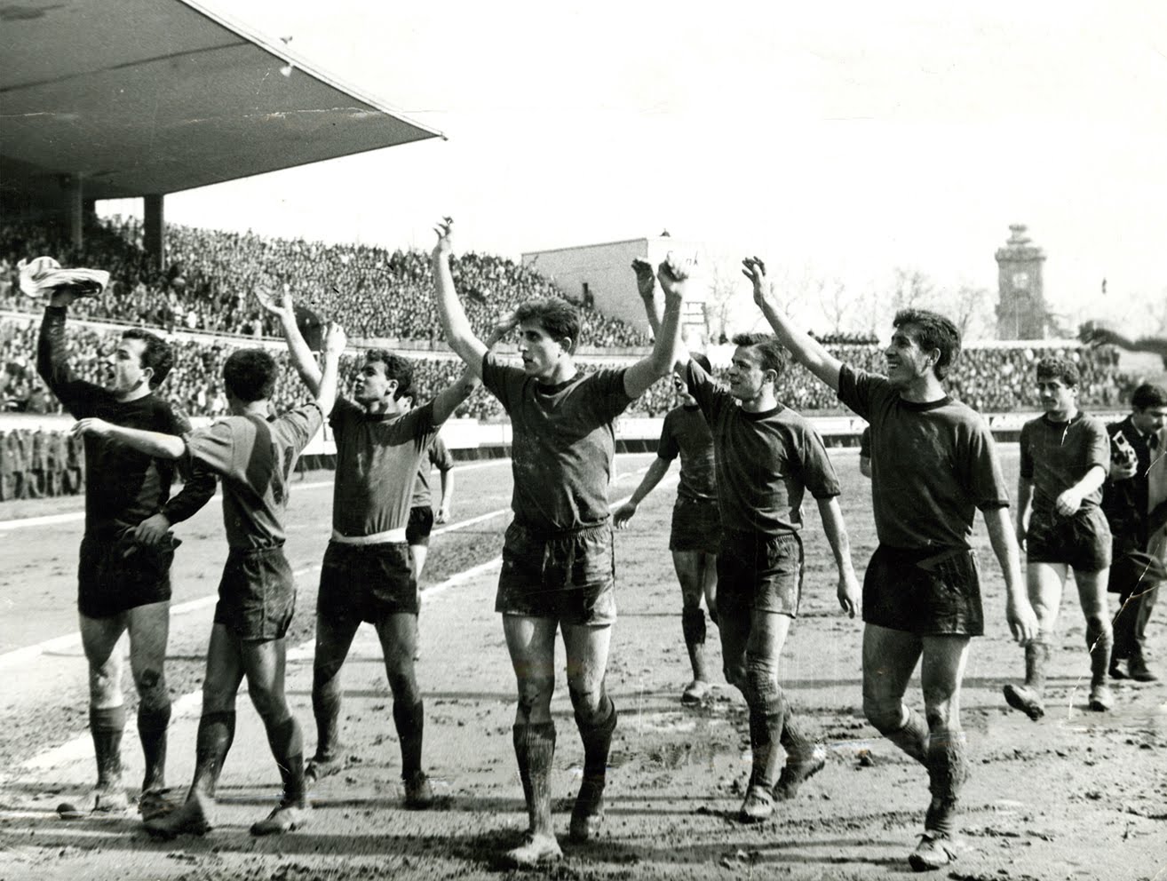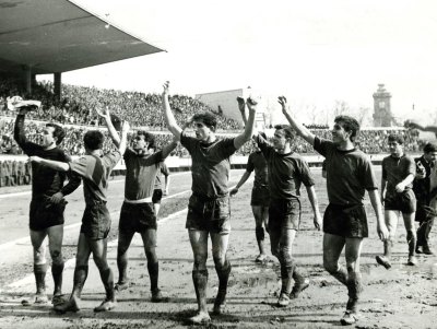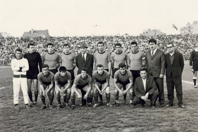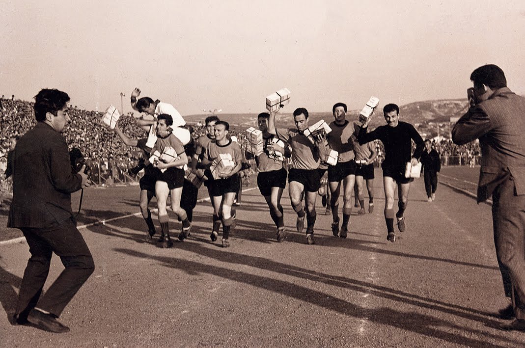 | Eskişehirsporlu futbolcular 27 Mart 1966’da İstanbul’da Beyoğluspor’u 3-1 yendikleri ikinci lig yükselme grubu maçından sonra taraftarı selamlıyor. |
