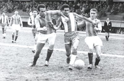 | Bir Göztepe-Feriköy maçı. Cahit Ellier ve Önder Sapanlı (sağ başta), Feriköylü İsmet Yurtsü’yü ikili markaja almışlar. |