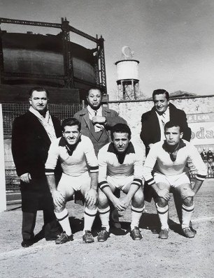 | Bir İzmirspor-Göztepe maçı. Nurettin Terzi topa kafa vurmuş, Cahit Ellier (sağdan ikinci) izliyor. |