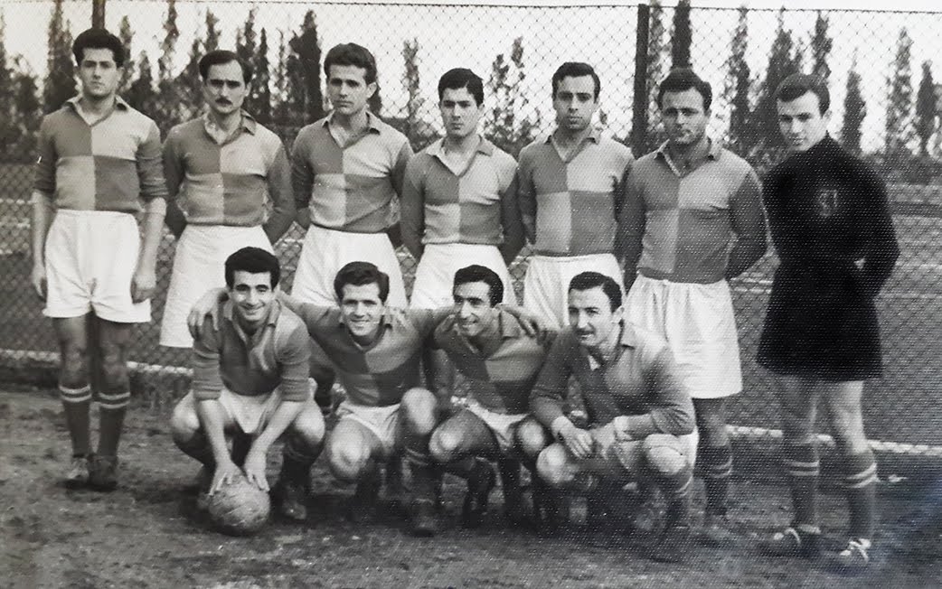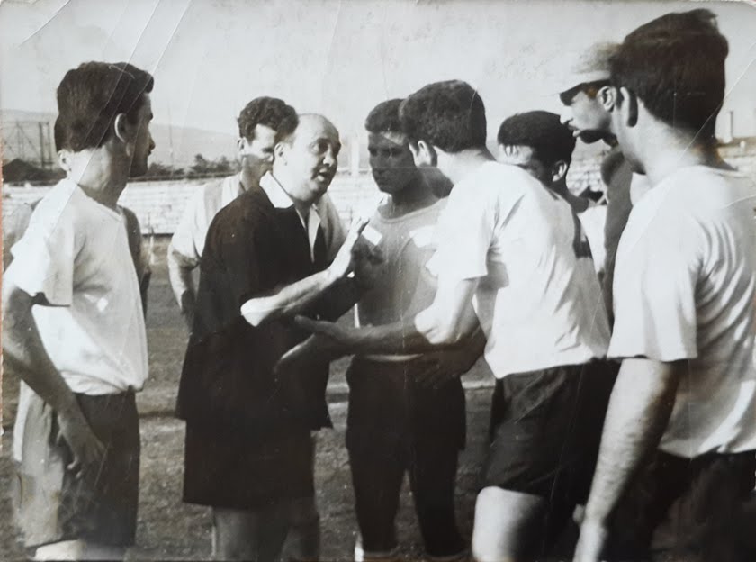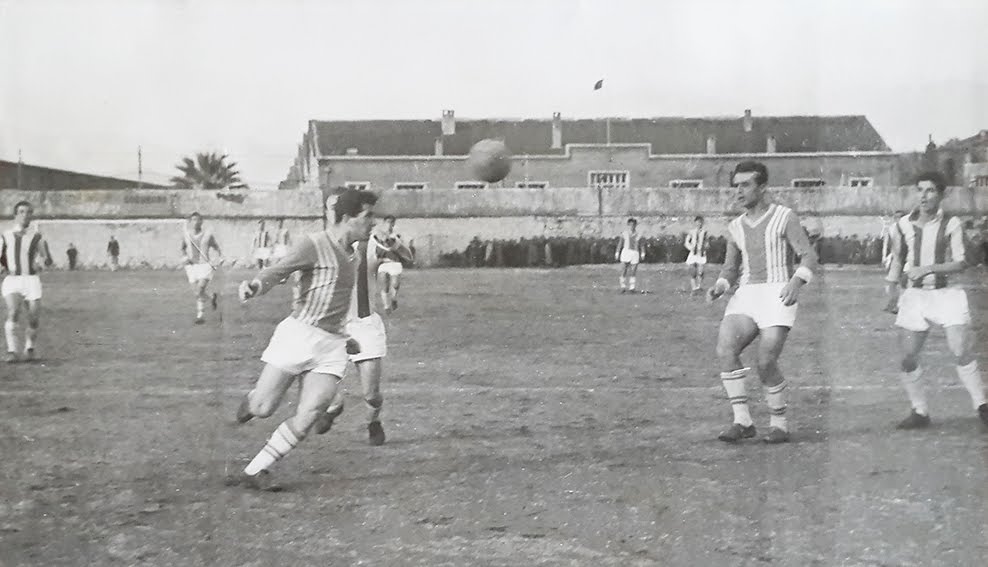 | Bir İzmirspor-Göztepe maçı. Nurettin Terzi topa kafa vurmuş, Cahit Ellier (sağdan ikinci) izliyor. |