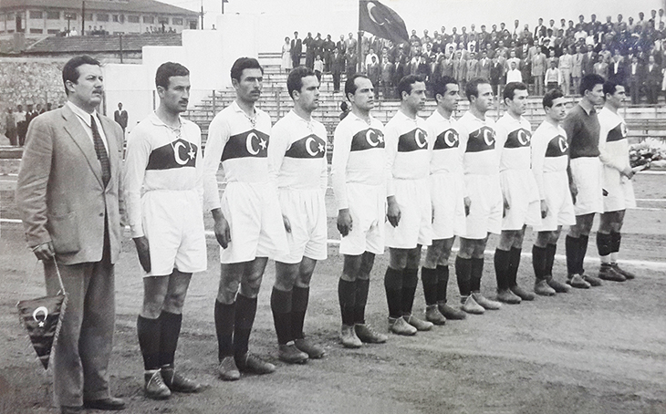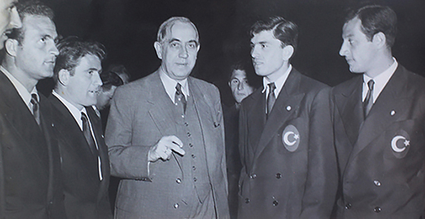 Futbolcularımız milli maç için gittikleri Berlin’de verilen resepsiyonda. Soldan sağa: İsmet Yamanoğlu, Tarık Gençay, Naci Özkaya, Batı Berlin Belediye Başkanı Ernst Reuter, Melih Ilgaz, Recep Adanır. Almanya’nın savaş sonrası ikiye bölünmesi ardından, Batı Berlin’in ilk belediye başkanı olan Prof. Reuter, 1939-1945 arasında Ankara Üniversitesi Siyasal Bilgiler Fakültesi’nde şehircilik dersleri vermişti.