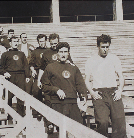 Milli futbolcular İsveç’te antrenmana çıkıyor. Önde Lefter ve Mehmet Ali Has, arkada Tarık Gençay, Eşref ve Recep Adanır, yönetici Adnan Akın ve kaleci Şükrü Ersoy.