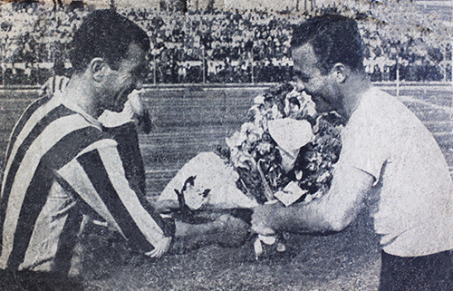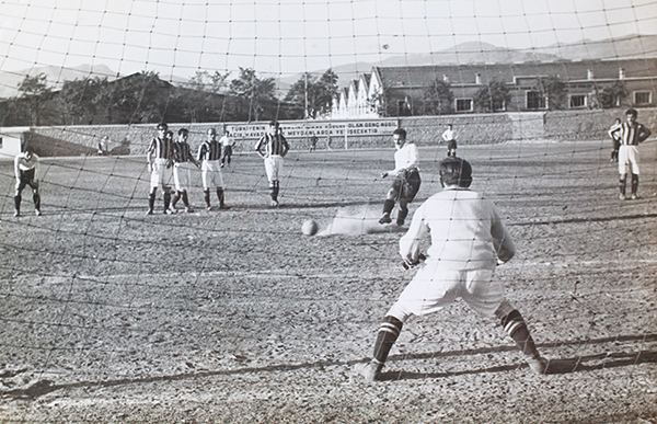 Gündüz Kılıç’ın Ankara Demirspor’da oynadığı yıllarda, Alsancak Stadı’nda İzmir ve Ankara karmalarının maçı. x işaretli Tarık Gençay, Baba Gündüz’le havada mücadelede.