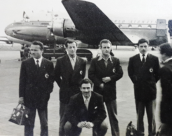8 Aralık 1950’de, Akdeniz Kupası maçı için Mısır’la karşılaşan Ümit Milli Takım kafilesi, Kahire’de Mısırlı yetkililerle birlikte. Tarık Gençay, alt sırada sağ başta görülüyor.