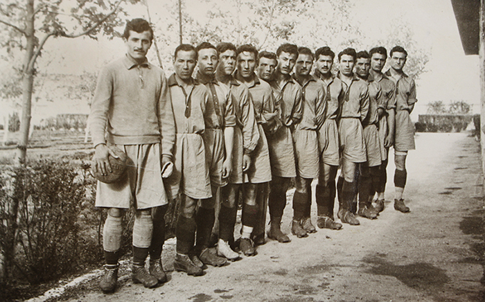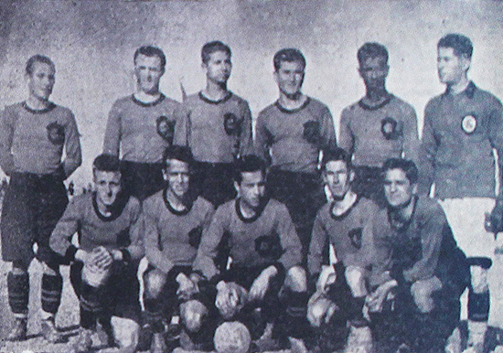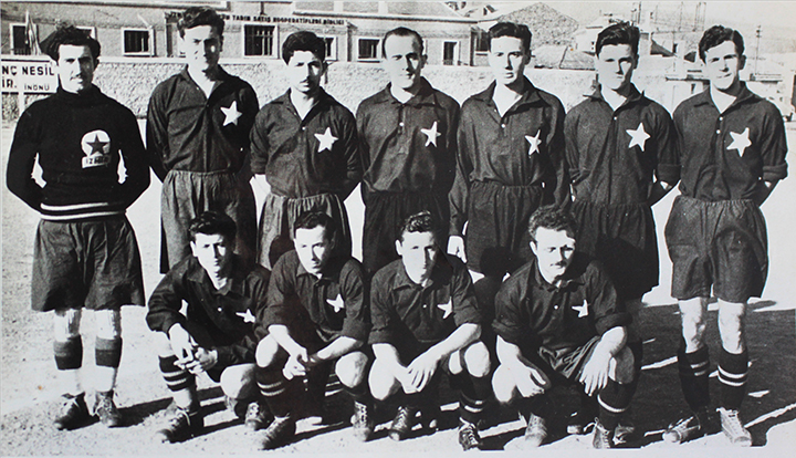 1945-46 sezonunda Milli Küme maçlarına katılan Kayagücü takımı, İstanbul Şeref Stadı’nda. Tarık Gençay alt sırada, sol başta görülüyor. (Kırmızı-Beyaz)