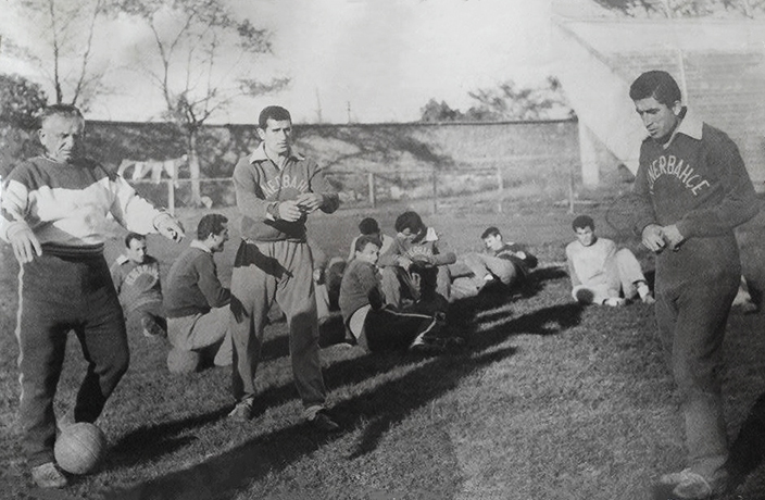1957-58 sezonunda Fenerbahçe Stadı’nda bir antrenman. Solda antrenör Molnar, ortada Turhan ve sağda Şirzat görülüyor.