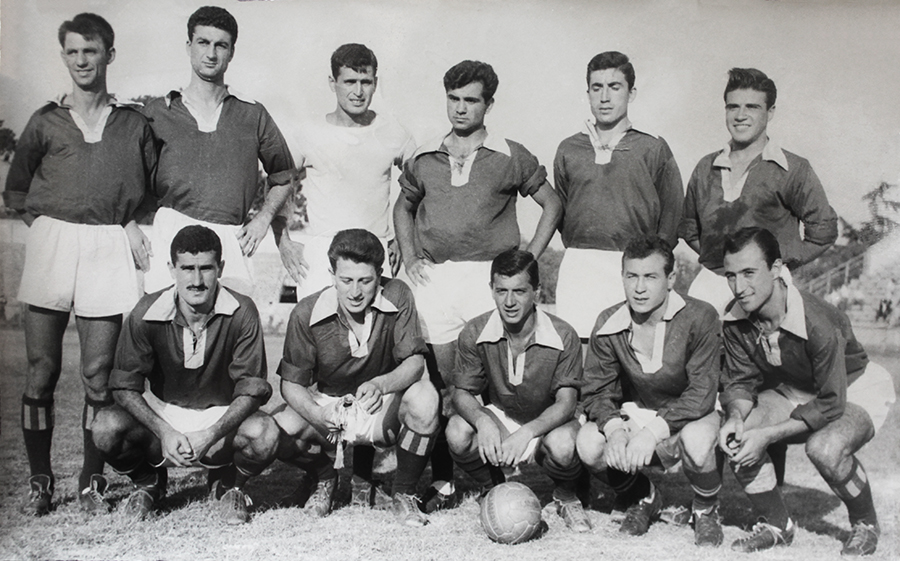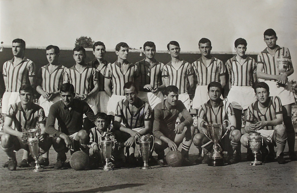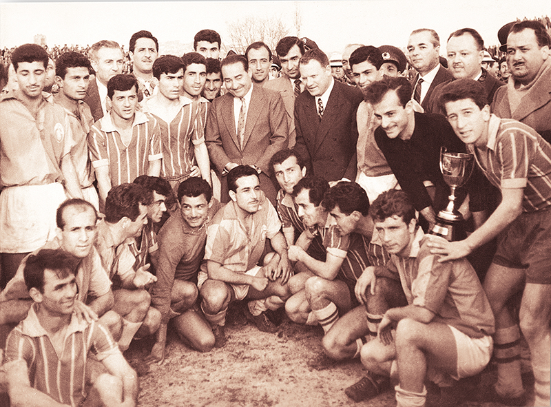 Fenerbahçeli ve Galatasaraylı oyuncularla idareciler, 30 Mart 1958’de Ankaragücü Stadı’nda oynanan Başvekil Kupası maçından sonra, başbakan Adnan Menderes ile bir arada.