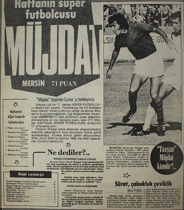 O yıl Giresunspor için başarılı geçmesine rağmen Müjdat Karanfilci, sezon sonunda takımdan ayrılmış. Bu kez Karadeniz’den Akdeniz’e inmiş ve tekrar birinci lige yükselen Mersin İdman Yurdu formasıyla top koşturmaya devam etmiş. “Giresun’a gittikten sonra talihim döndü. Fakat Giresun’da kalmadım çünkü kulüp çok para veremezdi. 75 bin liraya anlaştık Giresun’la. O sene evleniyordum. O yüzden 50 bin lira peşin istedim, onlar da kabul etti. O parayla evlenip, evimi döşedim. Sezon sonunda Beşiktaş, Galatasaray ve diğer takımlar istedi yine. O zaman 250 bin lira istiyordum. Bir kulübün yöneticisi, ‘Seni alırım ama aldığın paradan 100 bin lira ben alırım,’ dedi. Soyunma odasında, altta ikimiz konuşuyorduk. Ben kabul etmedim. Beşiktaş’ta Gündüz Tekin Onay hocaydı. Gittim konuştum, anlaştık. Fakat Balıkesirspor santrforu Özer vardı, onunla da konuşmuşlar. Sonra ne oldu bilmiyorum, onu tercih ettiler. Rahmetli Kadri Aytaç hem beni hem futbolumu çok severdi; geldi aldı beni, Mersin’e götürdü.”