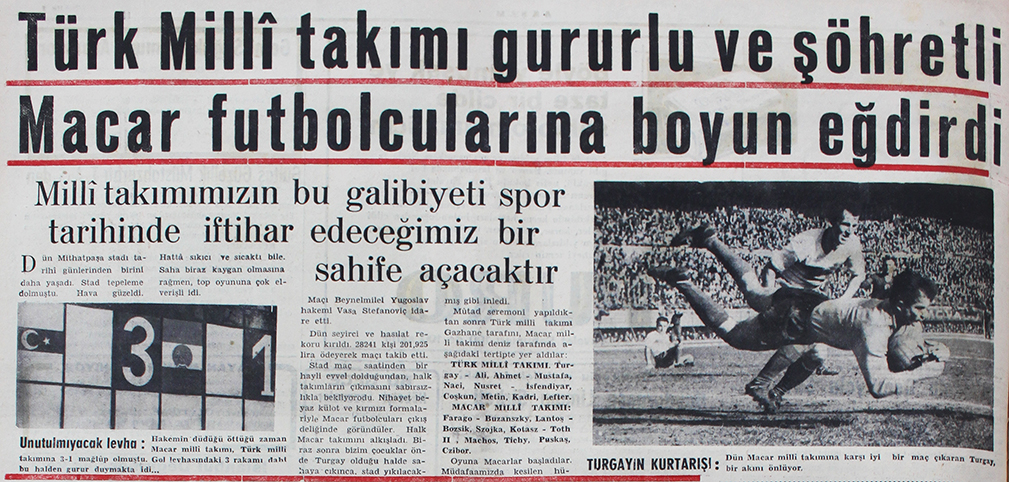 İki takım 19 Şubat 1956 Pazar günü, güneşli bir havada sahaya çıktı. Konuk ekip sahaya Farago-Buzanski, Lantoş, Bozsik, Szojka, Kotasz, Toth II, Machos, Tichy, Puşkaş, Czibor tertibiyle çıktı. Türk milli takımıysa WM sistemindeki mevkilerine göre sahada şu şekilde yer aldı: Kaleci Turgay Şeren, sağ bek Ali Beratlıgil, sol bek Ahmet Berman, sağ haf Beton Mustafa Ertan, santrhaf Naci Erdem, sol haf Nusret Ülük, sağ açık İsfendiyar Açıksöz, sağ iç Coşkun Özarı, santrfor Metin Oktay, sol iç Kadri Aytaç, sol açık Lefter Küçükandonyadis. Oyuna çok hırslı ve hızlı başlayan Milli Takım henüz 6. dakikada ilk golüne kavuştu. Bu golü spiker Pertev Tunaseli’nin yıllar sonra bir gazetede, radyoda maç anlatır gibi bir üslupla hazırladığı yazısından okuyalım: “Uzun bir orta. Ali kafaya çıktı. Naci.. bastıramadılar, sol açık yerinden Czibor geliyor. Kaptı, düzeltti. Mustafa gidiyor. Nafile.. altı pasa girdi, çaktı. Turgay, bravo Turgay. Uçtu kurtardı. Tam göğsünde. Muhakkak goldü. Top hâlâ elinde kaptanın. Czibor’un şutunu, hem de gollük şutunu aldı Turgay. … Uzun degaj. Sağ açıkta İsfendiyar var. Önünde Lantoş. İsfendiyar yakaladı topu. İyi stop etti. Lantoş kendinden emin geliyor üzerine, aman. Çaktı çalımı İsfendiyar, rüzgar gibi gidiyor sağ açıktan. Ceza sahasına doğru tek başına gidiyor. Kotasz yetişecek, ceza sahasının köşesinde yakalayacak gibi onu. Birden attı ortasını İsfendiyar. Top penaltı noktasına doğru süzülüyor. Szojka çıkacak kafaya. Geçti üzerinden. Sol iç yerinde Lefter.. çaktı voleyi. Sol köşe.. Golll… Golll… Golll… Farago uçtü fakat top girdi içeriye.”8