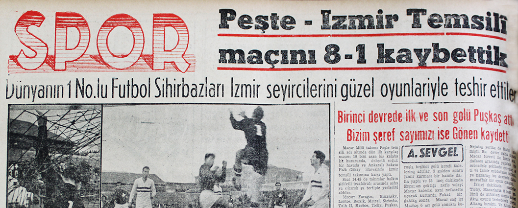 İstanbul’un aksine İzmir’de soğuk fakat güneşli bir gün vardı. Günlerden beri dünya yıldızlarının gelmesini merakla bekleyen İzmirli futbolseverler maçlara büyük ilgi göstermişti. Bu yüzden Alsancak Stadı’nın koşu pistine ilave sandalyeler yerleştirilmişti. Böylece 8 Şubat’ta, 10 bini aşkın bir seyirci kitlesi önünde oynanan ilk karşılaşmada Macar misafirler kendilerinden beklenen şovu gerçekleştirerek İzmir Karmasını 8-1 yendi. Puşkaş ilk golü kaydettiğinde maçın henüz 30’uncu saniyesiydi. İzmirli futbolcuların karşılarında dünya çapında şöhretli futbolcuları görünce, bir nevi felç yaşadıkları o tarihte Karşıyaka forması giyen Ergun Öztuna’nın şu sözlerinden anlaşılıyor: “Maç başlamak üzere, santra olacak. Bir baktım sahaya, Puşkaş tam karşımda duruyor; yanında Hidegkuti, Czibor, Bozsik gibi adamlar. O zamanın en ünlü futbolcuları hepsi. İngiltere’ye altı gol atmışlar.”3 Dış temasların bugüne kıyasla son derece az olduğu o günlerde bizim futbolcuların bu ruh hali içinde olması herhalde şaşılacak bir durum değildi. Bu şaşkınlık havası içinde 11’inci dakikada durum 3-0 olmuştu. “İzmir takımı bu üç golden sonra kendine gelir gibi oldu ve bir aralık Macar yarı sahasına geçebildi… Macar kalesine şut atılabileceği fikrini benimseyen İzmirliler akınlarına devam ettiler.”4 Nitekim İzmir Karması, 17’inci dakikada Gönen’in şutuna Macar bekin ayak koyması sonucu kalecinin kontrpiyede kalmasıyla tek golüne kavuştu.  İlk yarı 7-1 bittikten sonra Macarlar kendilerini fazla sıkmadılar ve ikinci yarıda sadece bir gol attılar.