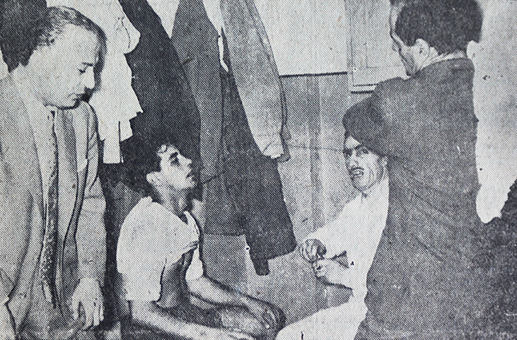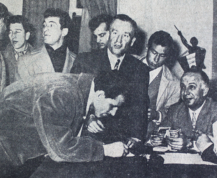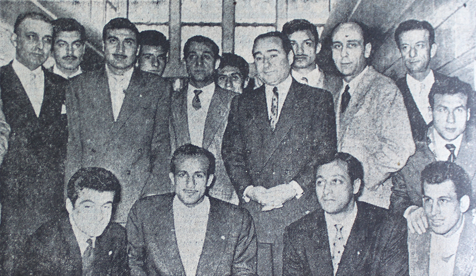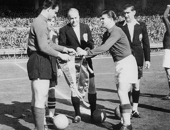 Peşte Karması kaptanı Puşkaş (sağ başta), maçın hakemi Faik Gökay, yan hakemler Hakkı Gürüz (soldaki), Dündar Karakaplan ve İzmir Karması kaptanı Altaylı Bayram Dinsel maçtan önce. (Akşam)