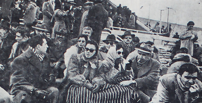 Ali Beratlıgil (2), Naci Erdem ve arkasında Turgay Şeren, topu uzaklaştırma gayreti içinde. Arka planda, tribünlerin altındaki duhuliyenin de tıklım tıklım dolu olduğu görülüyor.