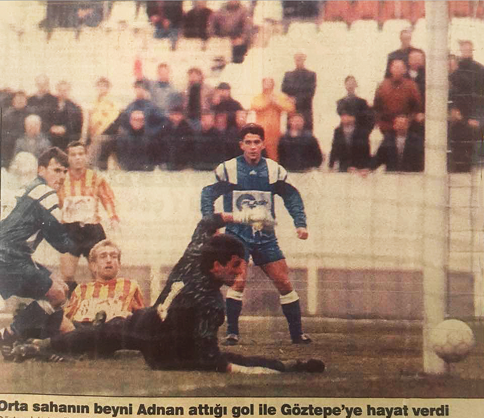 Kuşadası’nda iki sezon geçiren Adnan Esen, bunun ardından üçüncü kez bir sarı-kırmızılı takıma, o yıllarda İkinci Lig’de eski günlerine dönmek isteyen Göztepe’ye transfer olmuş. “90 senesinde Göztepe’ye geldim ve dört sezon oynadım. İlk sezon Altay’la çekiştik. Ben takım kaptanıydım. Altay’la ikinci maçta 2-2 berabere kaldık. İki golü de ben attım. Kaleci Zafer, Dino Zoff’un rekorunu kıracaktı. 1100 küsur dakika gol yememişti. Ben gol atınca rekor kırılamadı. O maça da çok üzülürüm. İki gol attım ama berabere bitti. Yenseydik beş puanlık fark ikiye inecekti. Bizim fikstür daha iyiydi, zayıf takımlarla oynuyorduk. Öyle olunca şampiyonluk şansımız daha fazla olacaktı. Fakat olmadı, puan farkını korudular ve şampiyon oldular. Biz 79 puan toplayıp ikinci olduk. Göztepe’nin uzun yıllar içinde şampiyonluğa en çok yaklaştığı sezon buydu. Zaman zaman görüştüğüm Göztepe taraftarlarının en çok üzüldüğü kadrodur, bu takımın kesin şampiyon olması lazımdı derler.”