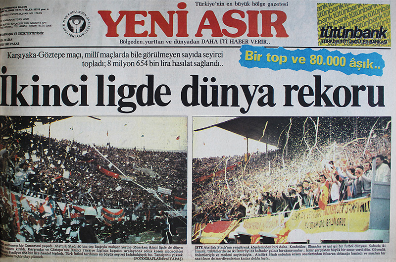 Bu maçtan sonra, sezonun sondan ikinci haftasında, futbol tarihimize “80 bin kişilik maç” olarak geçen meşhur Göztepe-Karşıyaka maçı oynandı. Bu maçta büyük bir seyirci patlaması yaşanmasının sebebi, iki İzmir kulübü arasında ulusal düzeyde bir ligde ilk defa bu çapta bir şampiyonluk yarışı yaşanmasıydı. Maçın heyecanı bir hafta öncesinden başlamış, bir gün önce satışa çıkarılan biletler birkaç saat içinde bitmişti. O günleri şöyle hatırlıyor Cihan Yıldırım: “O maçtan on gün kadar önce 5 Mayıs akşamı Hıdırellez nedeniyle Karşıyaka sahilinde büyük bir kutlama yapılmıştı. Alaybey’den Bostanlı’ya kadar yol trafiğe kapatılmış, karnaval düzenlenmişti. Muazzam bir kalabalık vardı. Her tarafa yeşil-kırmızı bayraklar asılmıştı. Maç günü eski Şaraphane’den Atatürk Stadına giden yola girdik. Oraya girdiğimiz sırada otobüsten açık tribünün üst tarafını gördük. Maçın başlamasına daha birkaç saat olduğu halde tribünün tepesine kadar dolduğunu görünce çok şaşırmıştım.” İki takımın da büyük gerginlik içinde oynadığı maç neredeyse hiç gol pozisyonu olmadan 0-0 berabere bitmişti. Cihan Yıldırım, takımının kaçırdığı önemli bir fırsatı şöyle hatırlıyor: “Göztepe maçında bir tane pozisyona girdik. Onda ben orta sahadan aldım topu, Göztepe ceza sahasına kadar girdim. Santrfora çıkarttım topu, vurdu ama dışarı attı.”