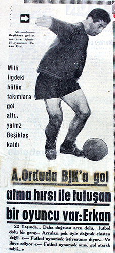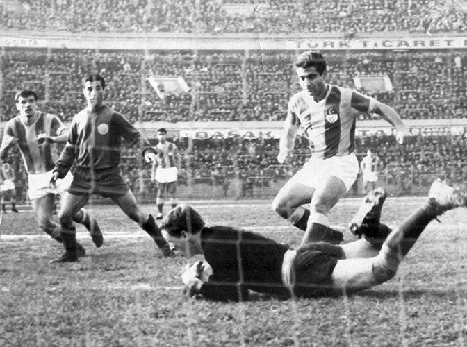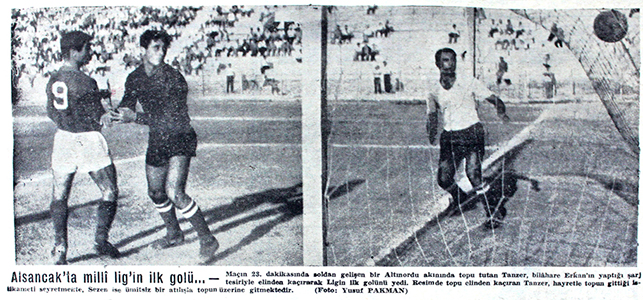 1964-65 sezonunun İzmir’de oynanan ilk maçında, Altınordu adına Erkan Velioğlu’nun İzmirspor’a attığı gol. (Yeni Asır)