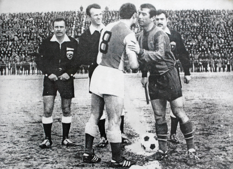 Alsancak Stadı’nda bir Altınordu-Galatasaray maçı öncesi. Takım kaptanları Erkan Velioğlu ve Ayhan Elmastaşoğlu öpüşüyor. Maçın hakemi Ertuğrul Dilek.