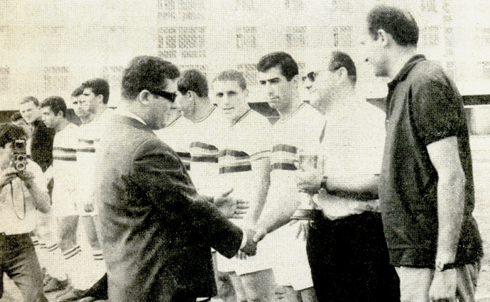 Altınordu başkanı Candoğan Sakaoğlu, 1965-66 sezonu Türkiye İkinci Ligi şampiyonluk kupasını alıyor. Yanında takım kaptanı Erkan Velioğlu görülüyor.