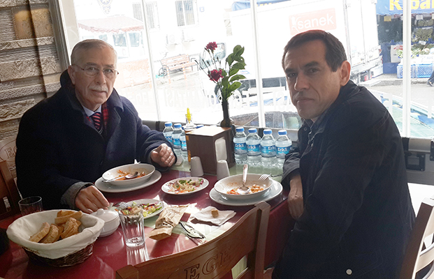 Yukarıda okuduğunuz keyifli sohbeti yaptıktan sonra Erkan Velioğlu’yla fırsat buldukça görüştük. Son olarak, 2015 Mart ayının sonlarında, seksen bin kişilik tarihî Göztepe-Karşıyaka maçının hikayesini yazmak amacıyla, o maçın kahramanlarıyla görüşmek için İzmir’e gittiğim zaman buluştuk. Uzun bir müddetten beri çağımızın sinsi hastalığından muzdaripti ve hastalığı epey ilerlemiş olduğundan evden dışarı çok nadir çıkıyordu. Buna rağmen, beni ilk kez görüştüğümüz mekana davet etmiş ve maçla ilgili hatıralarını anlatmıştı. Ardından da birlikte yemek yememiz için ısrar etmişti. Aşağıdaki fotoğraf o güne ait.