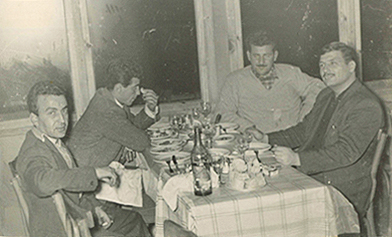 Fikret (sağ başta) ve Metin Oktay, 1956’da İstanbul’da bir yemekte, arkadaşlarıyla birlikteler. (Ahmet Piriştina Kent Arşivi ve Müzesi / Gülay Bedriye Beşikçi Bağışı Fonu)