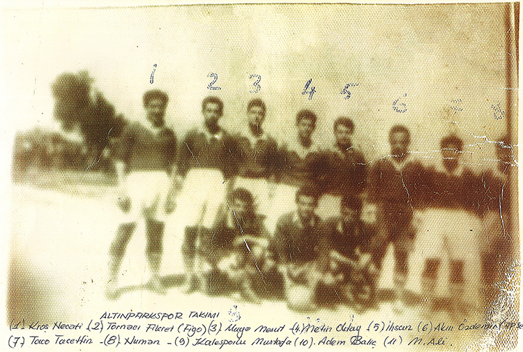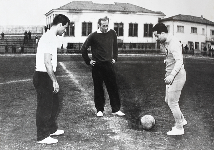 Metin Oktay, Gündüz Kılıç ve Coşkun Özarı, Alsancak Stadı’nda bir idmandalar. Arkada görülen binalar Alsancak İlkokulu’na ait. Altmışlı yılların ilk yarısında stadyum genişletilirken bu binalar yıkılıp yerine kapalı tribün yapılmıştı.