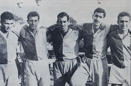 Eylül 1957’den bir kamp hatırası. Soldan sağa: Enver Özdemir, Metin Oktay, Ali Beratlıgil, Suat Mamat, Kamil Altan. (Milliyet)