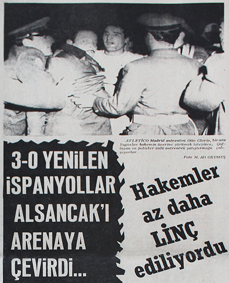 Üçüncü golün ardından Yugoslav hakem maçı bitiren düdüğü çaldı ve saha bir anda karıştı. Maç boyunca birçok karara itiraz eden futbolcular, müsabakanın normal süreden 10 dakika fazla devam ettiğini, son golün de bu sırada atıldığını iddia ederek hakemlere saldırdılar. İspanyol futbolcular öyle öfkeliydi ki, korner bayrağı direkleri ve hatta tekmelerle onlara vurmaya başlamışlardı. Hakemleri korumak için sahaya giren polisler İspanyol futbolculara sert şekilde müdahale etti. Bunun sonucunda, İspanyol ekibinin öfkesinden sadece hakemler ve polisler değil, sahada bulunan herkes nasibini aldı. Milliyet gazetesi foto muhabiri Hüseyin Kırcalı, kendini Atletico Madrid’in Brezilyalı antrenörünün gazabından korumak için fotoğraf makinesini bir savunma silahı gibi kullanmak zorunda kalmış ve makine Otto Gloria’nın kafasında parçalanmıştı. Kırcalı sonraki iki günü nezarette geçirmek zorunda kalmıştı.