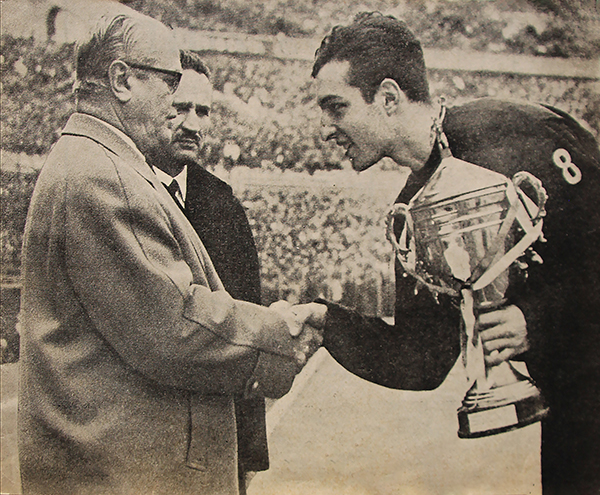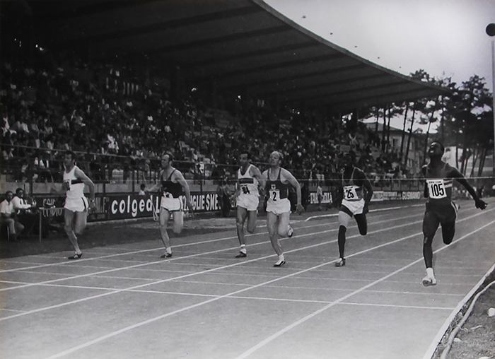 1969’da 100 metre rekorunu 10,5 ile egale ettiği yarışın birincilik kürsüsünde.